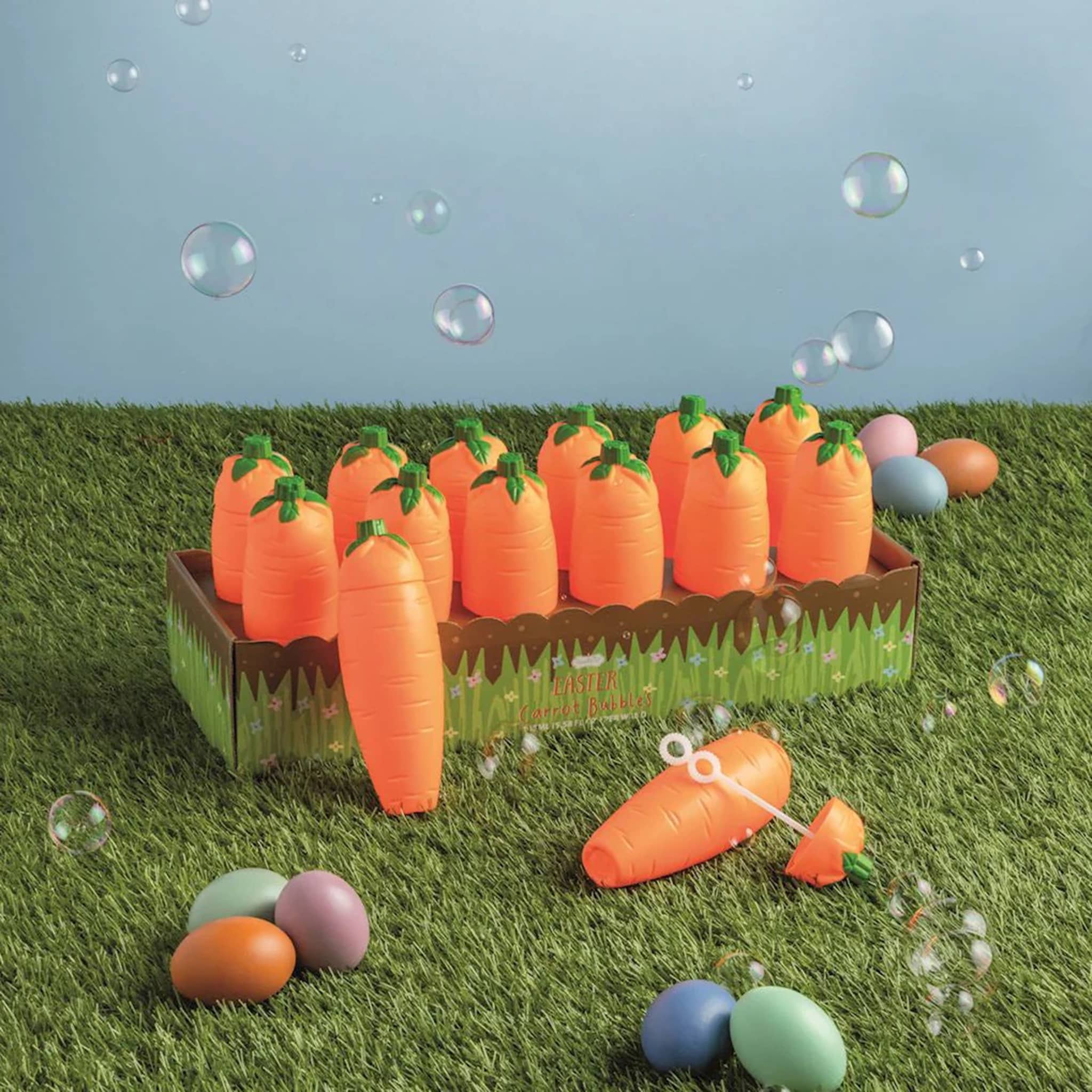 Hop into springtime fun with these delightful carrot-shaped bubbles! Perfect for Easter baskets, these whimsical bubbles bring endless entertainment to kids of all ages. Watch as the bubbles float through the air, creating magical moments during spring celebrations, Easter egg hunts, and outdoor playtime. Add a playful touch to your Easter festivities with this charming bubble toy that keeps kids engaged and smiling all day long. Plastic carrot tube measures approximately 6.5 x 2.5 inches. Suitable for ages 3 and up.