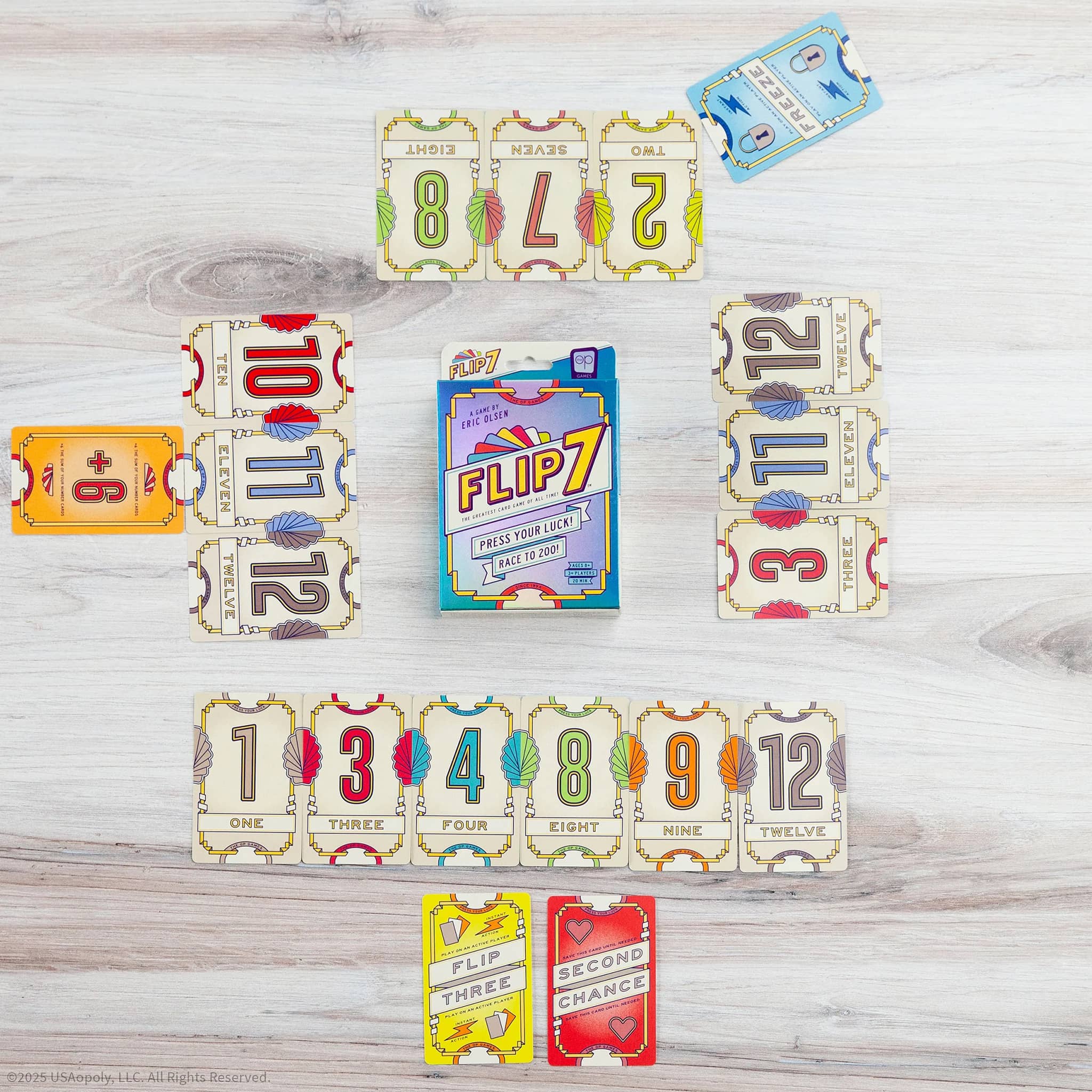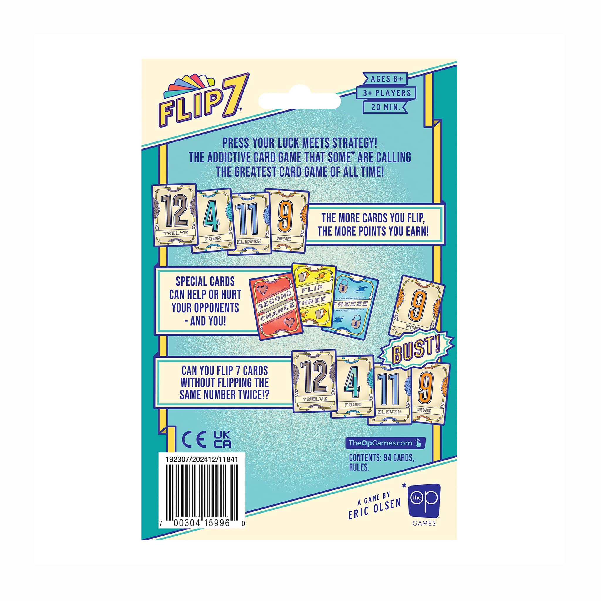 Flip over cards one by one without flipping the same number twice. Sound easy? Think again! This isn't just any deck of cards… In Flip 7™ there's only one 1 card, two 2's, three 3’s, etc plus a bunch of special cards that can score you extra points, give you a second chance, or freeze you or your opponents in your tracks. When at least one player hits 200 at the end of a round, the highest points win the game! Includes 94 cards and rules.