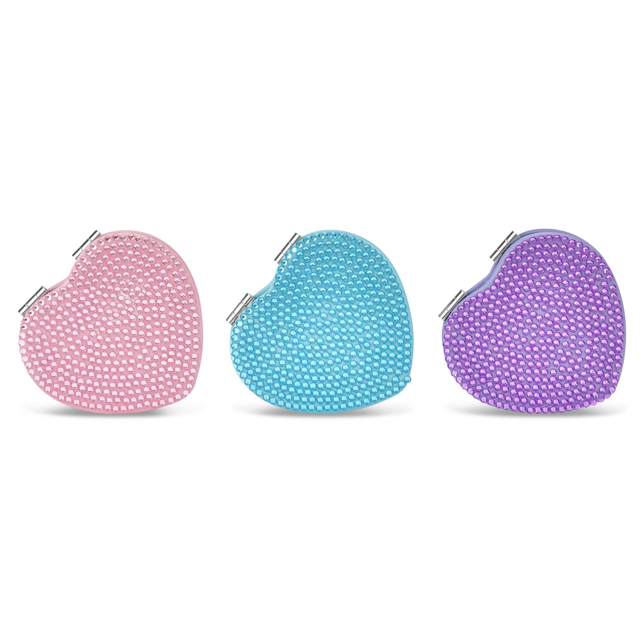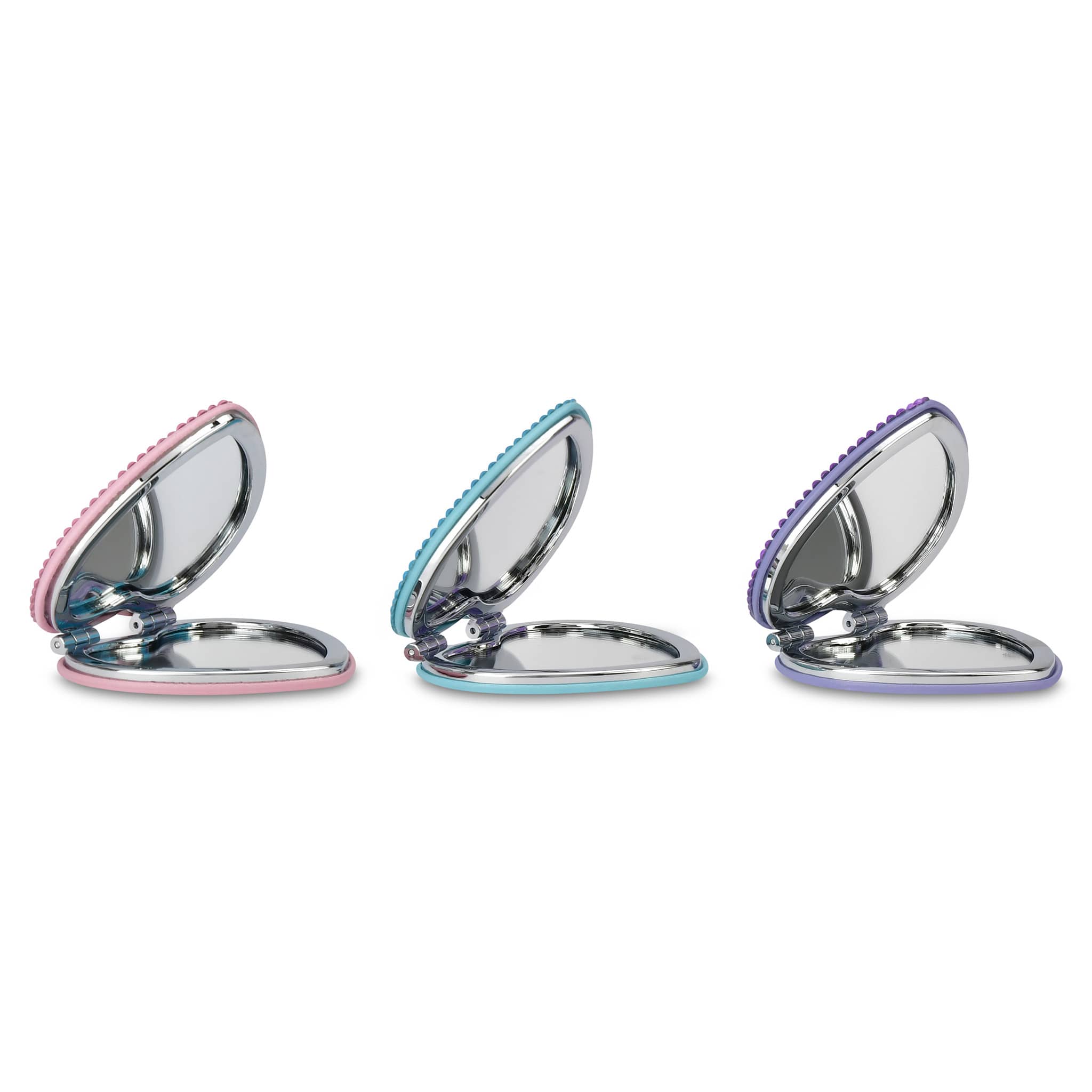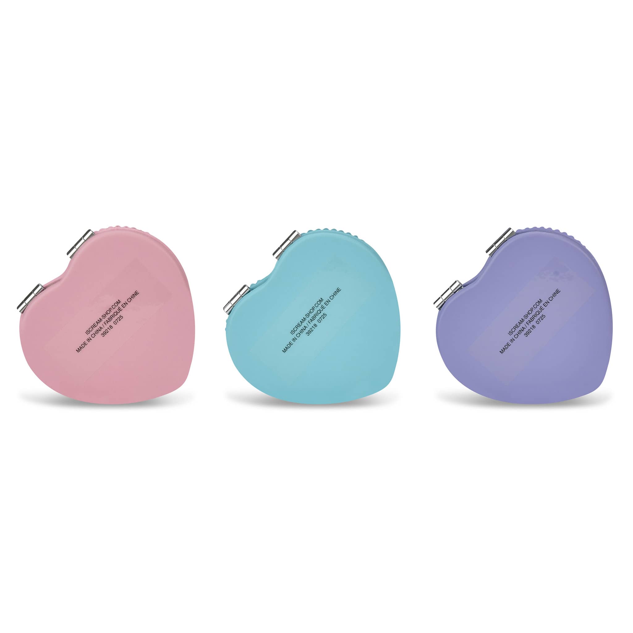 Add a little sparkle to touch-ups with this fun heart-shaped mirror compact for kids and tweens. Designed with a dazzling front covered in shimmering rhinestones, this compact comes in eye-catching pink, turquoise, or purple for extra personality and shine. The smooth, solid-color back makes it easy to hold, while the compact size is perfect for backpacks, purses, or sleepover bags. Ideal for play, dress-up, or on-the-go checks, this sparkly heart mirror makes a sweet gift, party favor, or just-because treat. Measures 3 x 2.75 inches when closed.