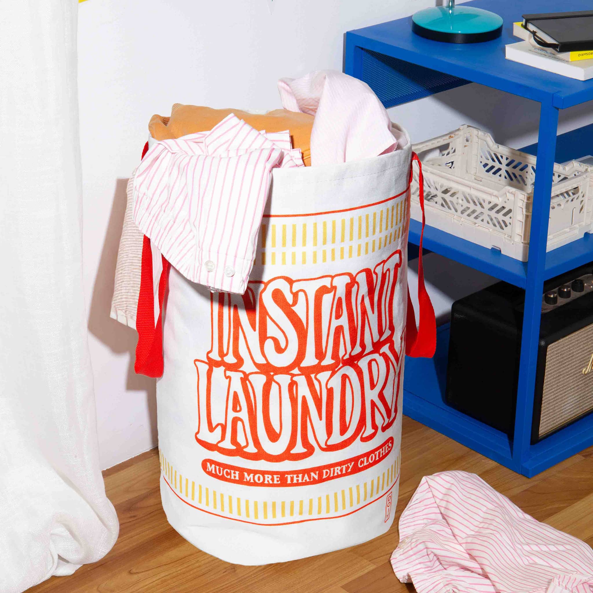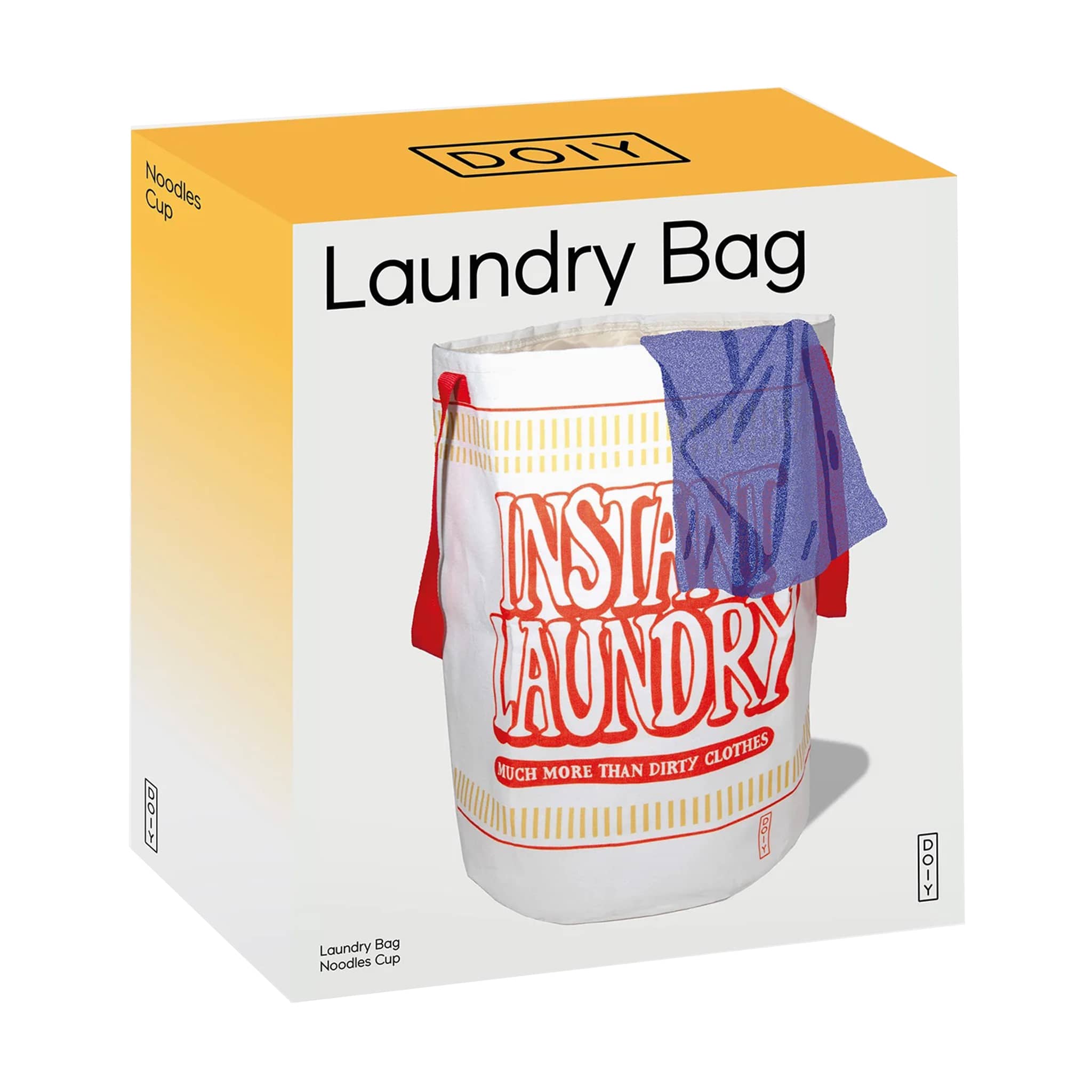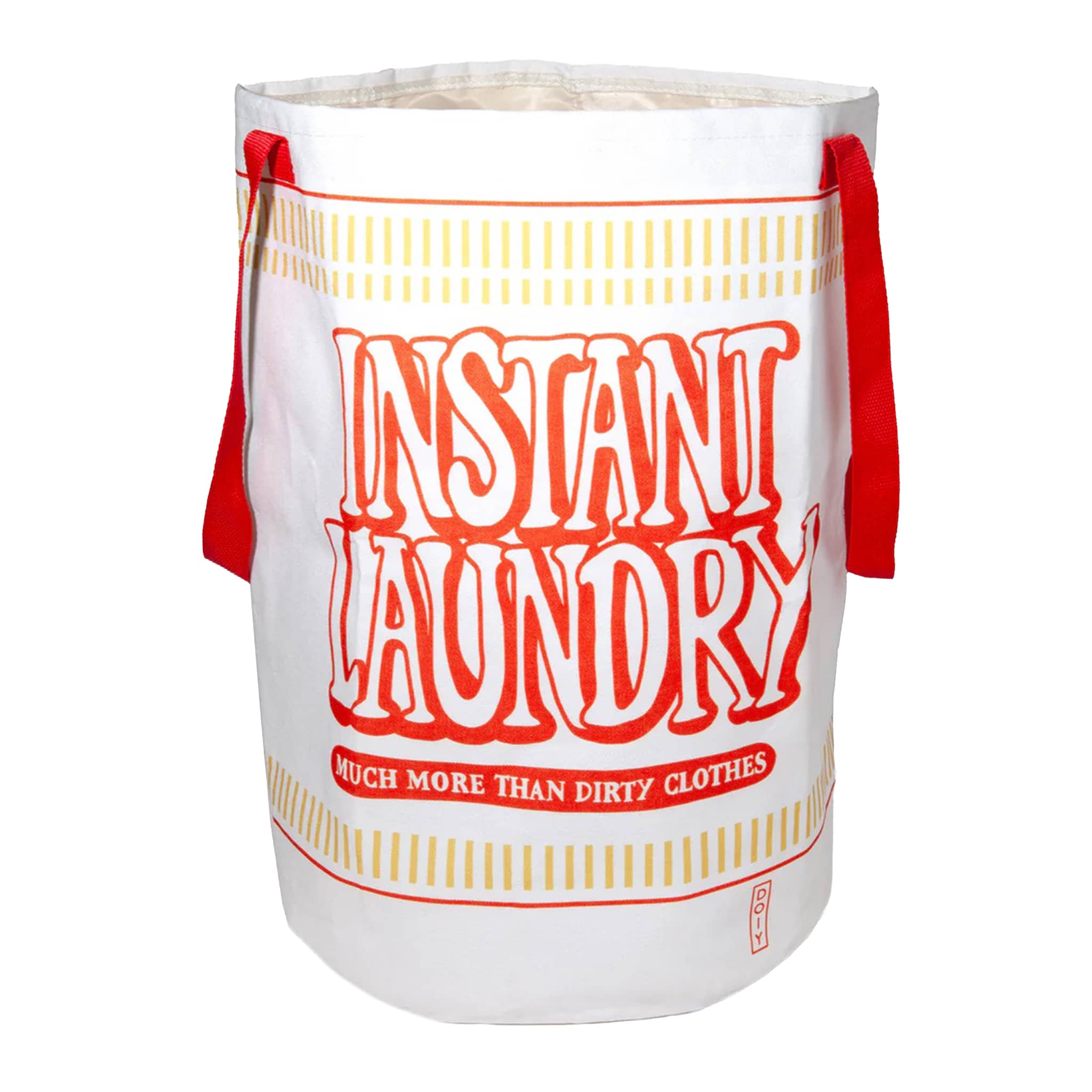 Add flavor to laundry day with our Instant Ramen Laundry Bag. Shaped like a classic cup noodle, this quirky and functional bag brings a playful twist to your washing routine. Lightweight, foldable, and spacious—it's perfect for storing dirty clothes at home, in dorms, or on-the-go. Who knew doing laundry could look this delicious? White laundry bag with red type that looks like a cup of instant noodles. Box packaging measures approximately 7 x 2.75 x 8 inches.
