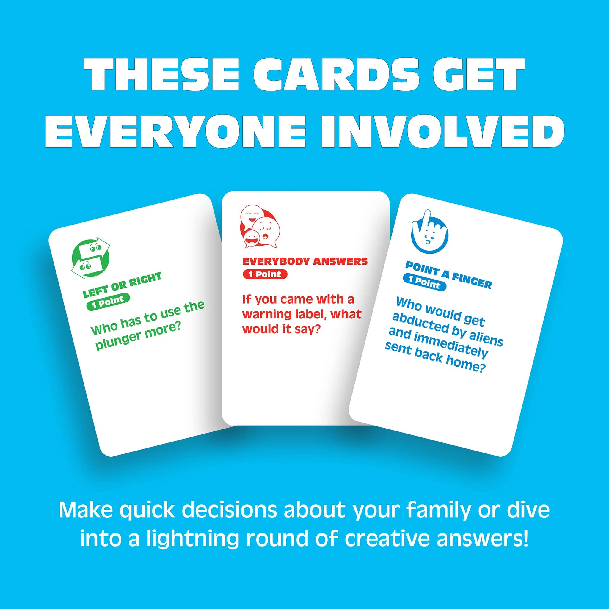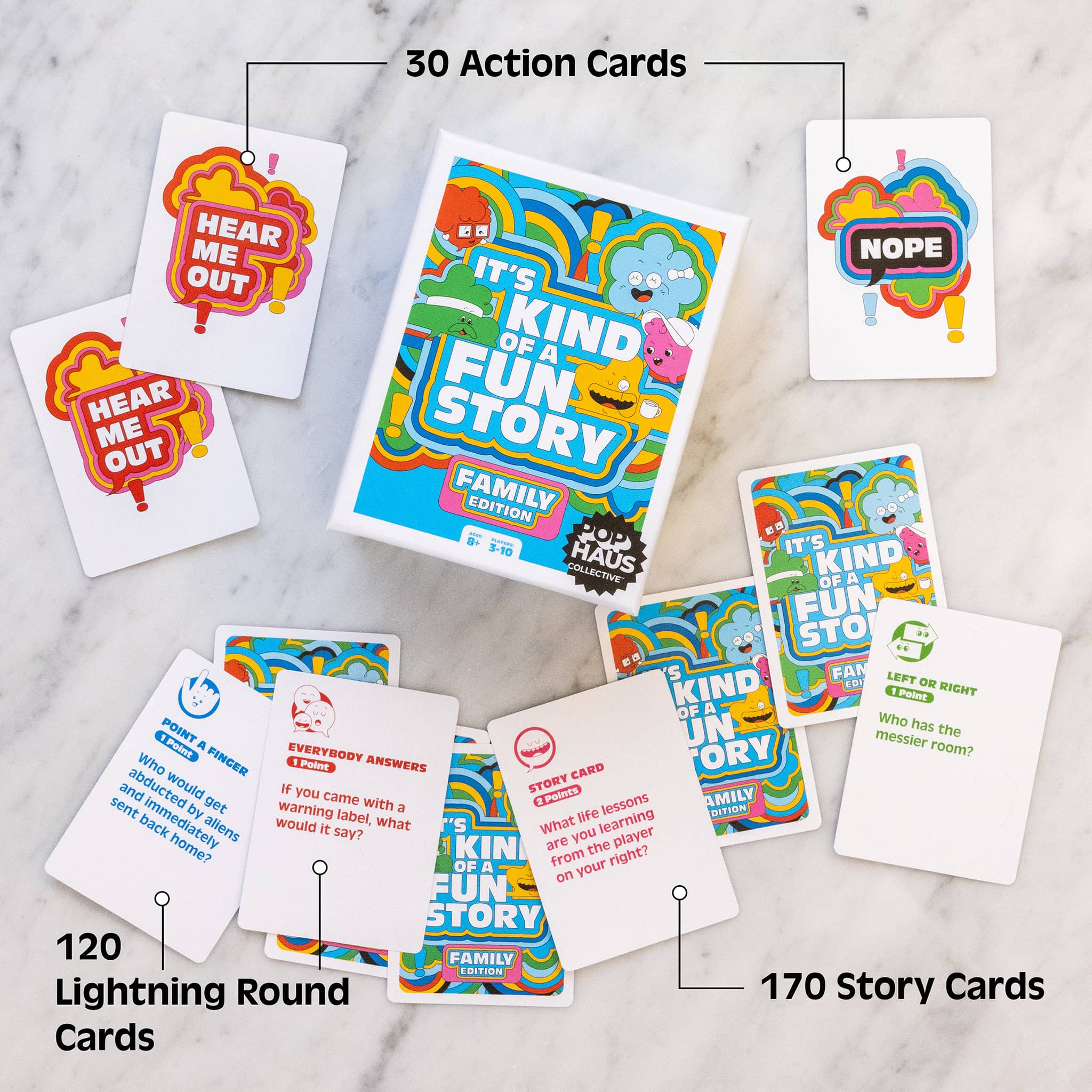 It's so easy to learn and fun to play! Take turns drawing cards and answering questions to be the first player to earn seven points! Story Cards put you in the spotlight to share your story, but watch out, if another player thinks they have a better tale, they can play a Hear Me Out Card to try to steal your points. Left or Right, Point a Finger, and Everybody Answers cards make every round fast, fun, and full of surprises. This storytelling game for kids keeps everyone engaged from start to finish.