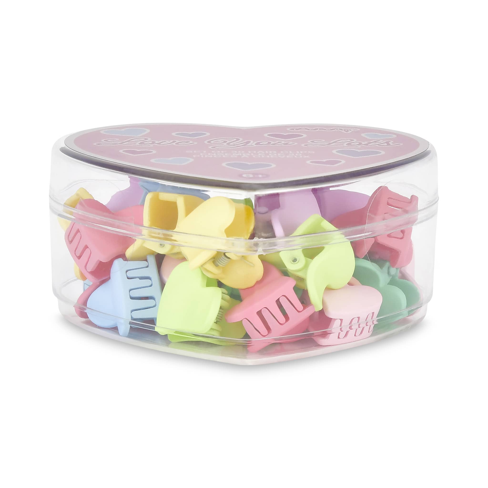 Sweeten any hairstyle with this adorable pack of 30 mini heart-shaped hair clips. Featuring an assortment of soft pastel colors, these tiny clips add a playful pop of charm while keeping hair neatly in place. Perfect for kids, teens, or anyone who loves cute accessories, they’re great for everyday wear, parties, and themed outfits. The clips come packaged in a clear acrylic heart-shaped box that’s both gift-ready and perfect for storing or displaying. A fun and colorful hair accessory set that’s ideal for Valentine’s Day, party favors, or just adding a little love to your look. Clips measure approximately 0.75 x 0.75 inches. Heart-shaped box packaging measures 3.25 x 3 inches. Suitable for ages 6 and up.
