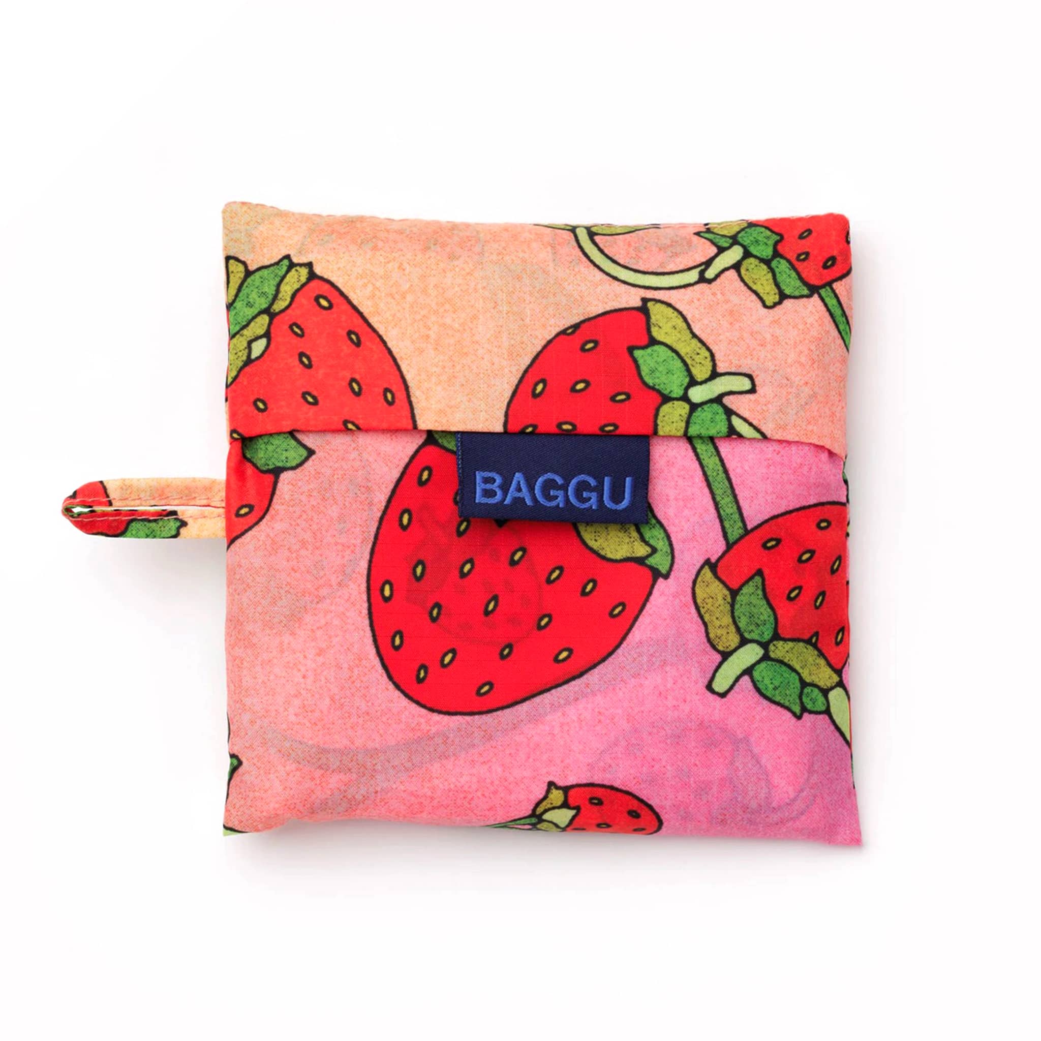 This best-selling eco-friendly reusable bag from BAGGU is not just for the grocery store; it can go everywhere and haul almost anything! The Strawberry Blossom print features juicy red strawberries and blossoms on a pink and orange ombre backdrop. The built-in straps can be used as a shoulder bag or carried in your hand. Holds the equivalent of two to three single-use plastic grocery bags worth of stuff, up to 40 pounds!