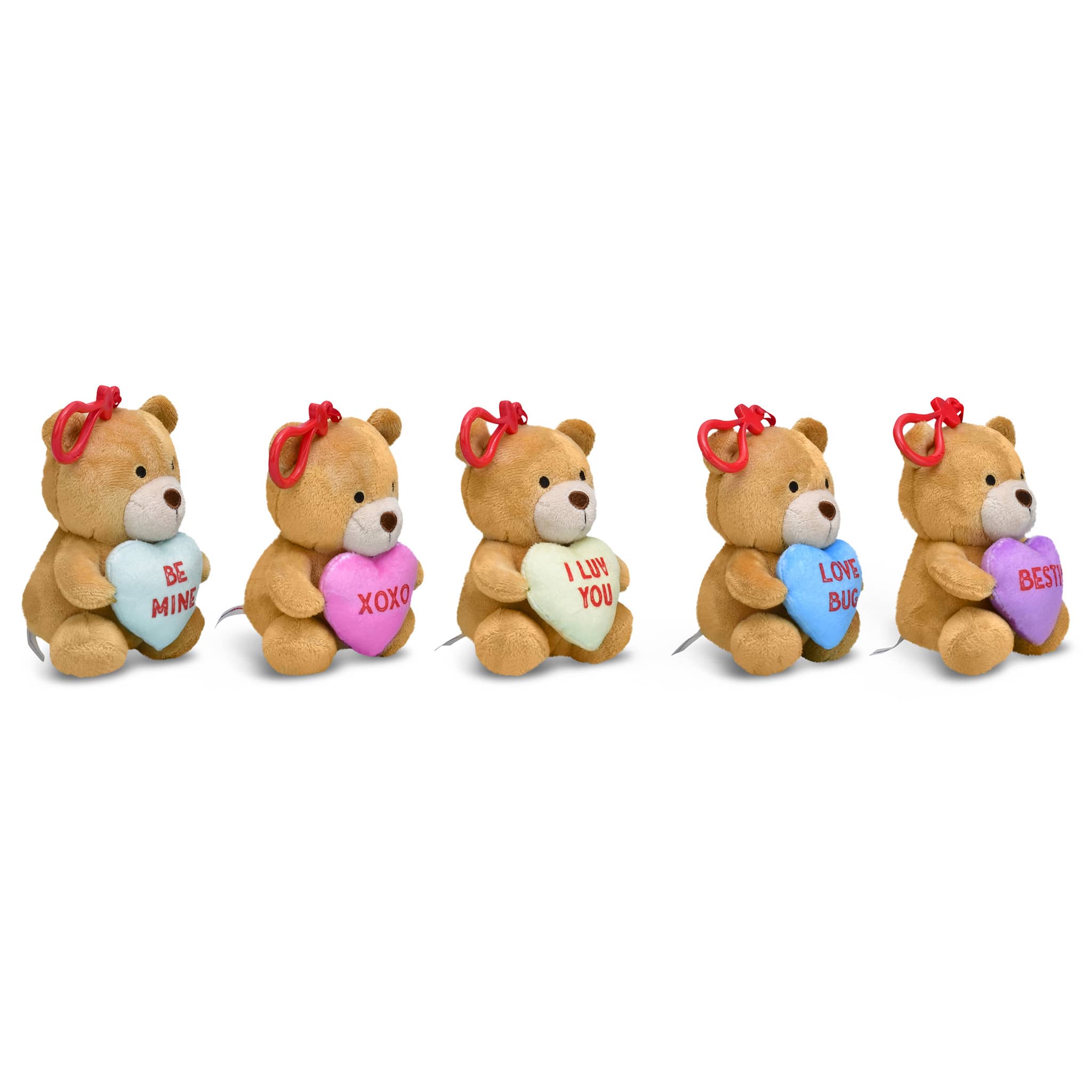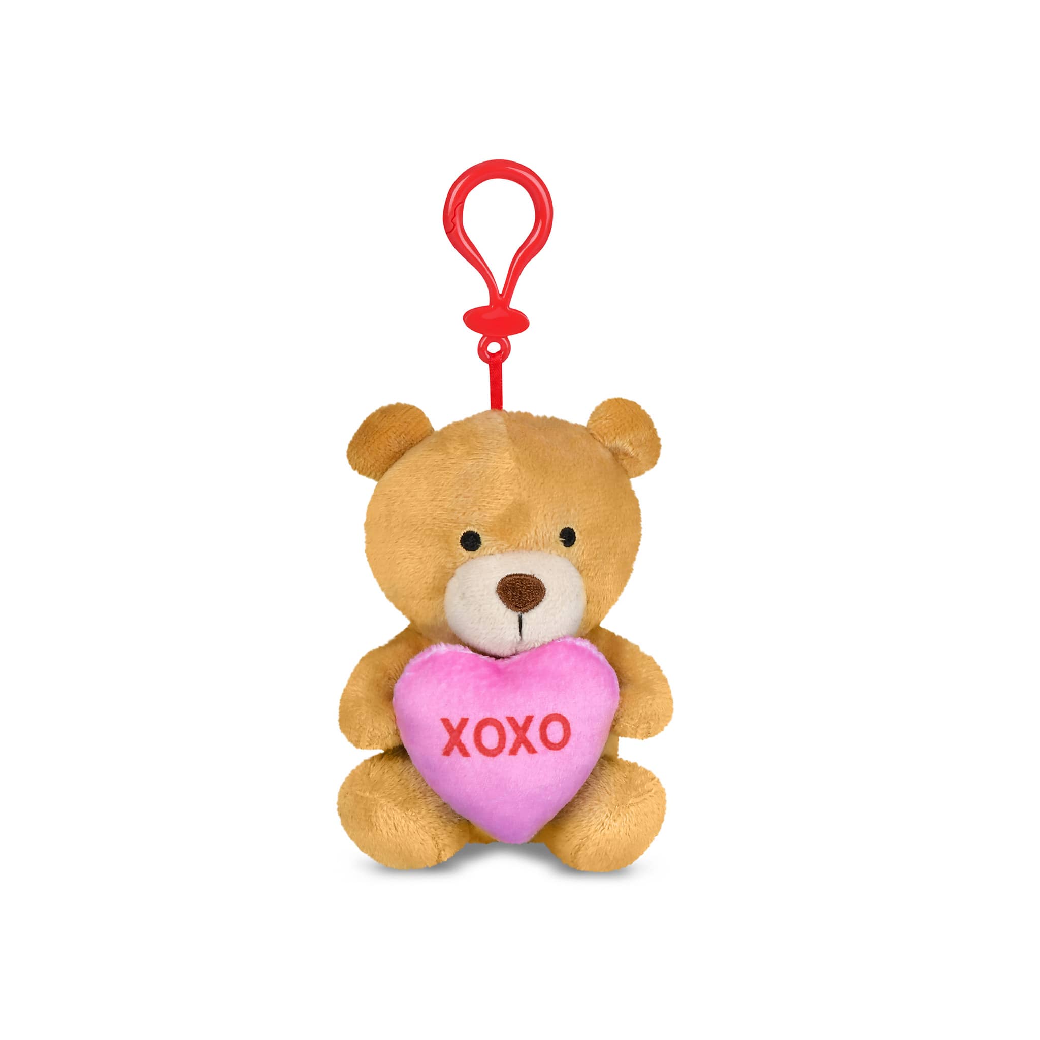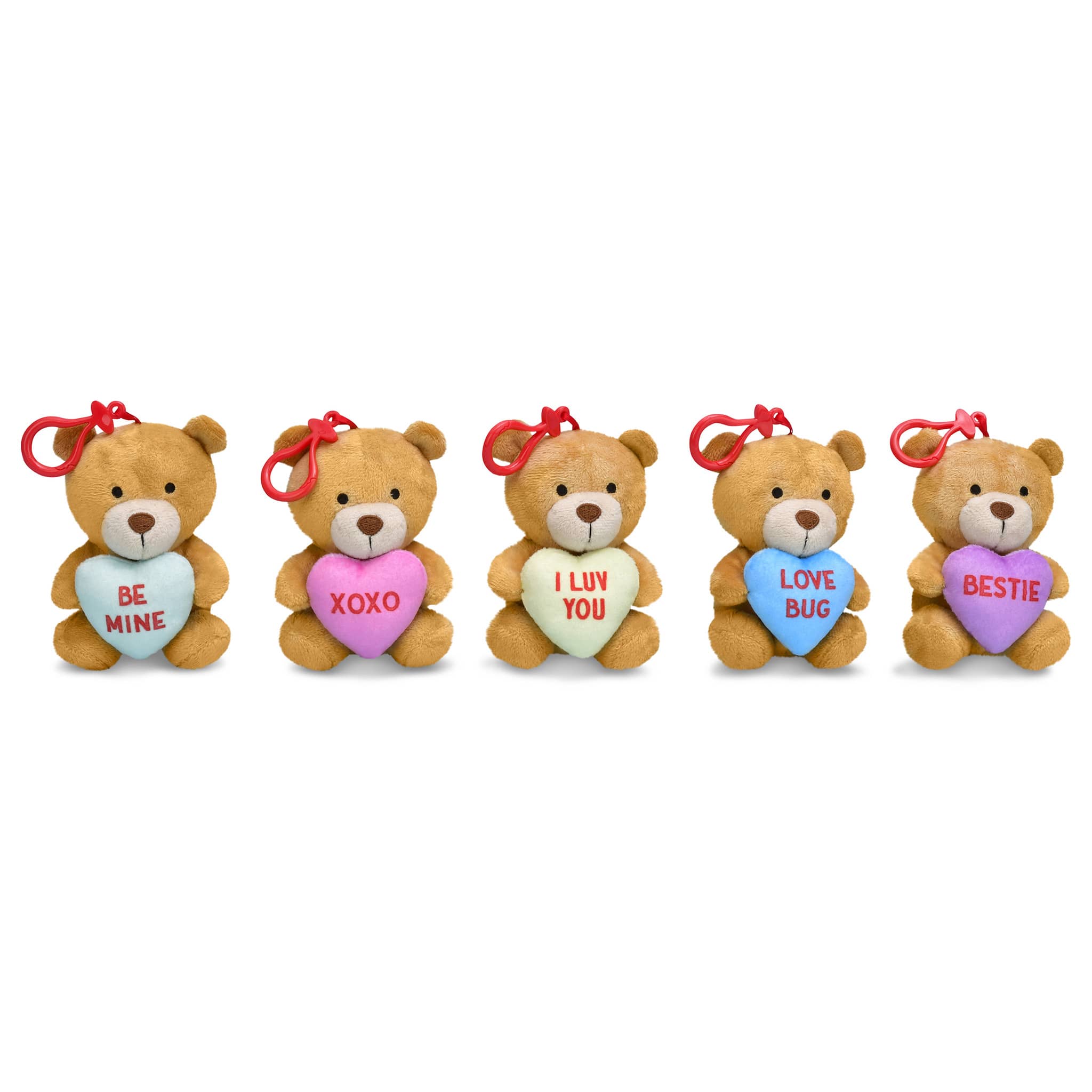 Add a dose of candy-inspired cuteness with Sweethearts™ Plush Bear Bag Charms. Officially licensed by the classic Sweethearts conversation hearts candy, these adorable furry charms feature a tan plush bear holding a colorful heart with a sweet message. Made from 100% polyester plush with 100% polyfiber fill, each charm includes embroidered details for a high-quality, lovable finish. A sturdy red plastic clip makes it easy to attach to backpacks, purses, totes, or keyrings. Available in five charming styles—Be Mine, XOXO, I Luv You, Love Bug, and Bestie—each with its own heart color and message. A fun collectible accessory that’s perfect for gifting, trading, or spreading a little love everywhere you go. Bear measures 4.5 inches tall.