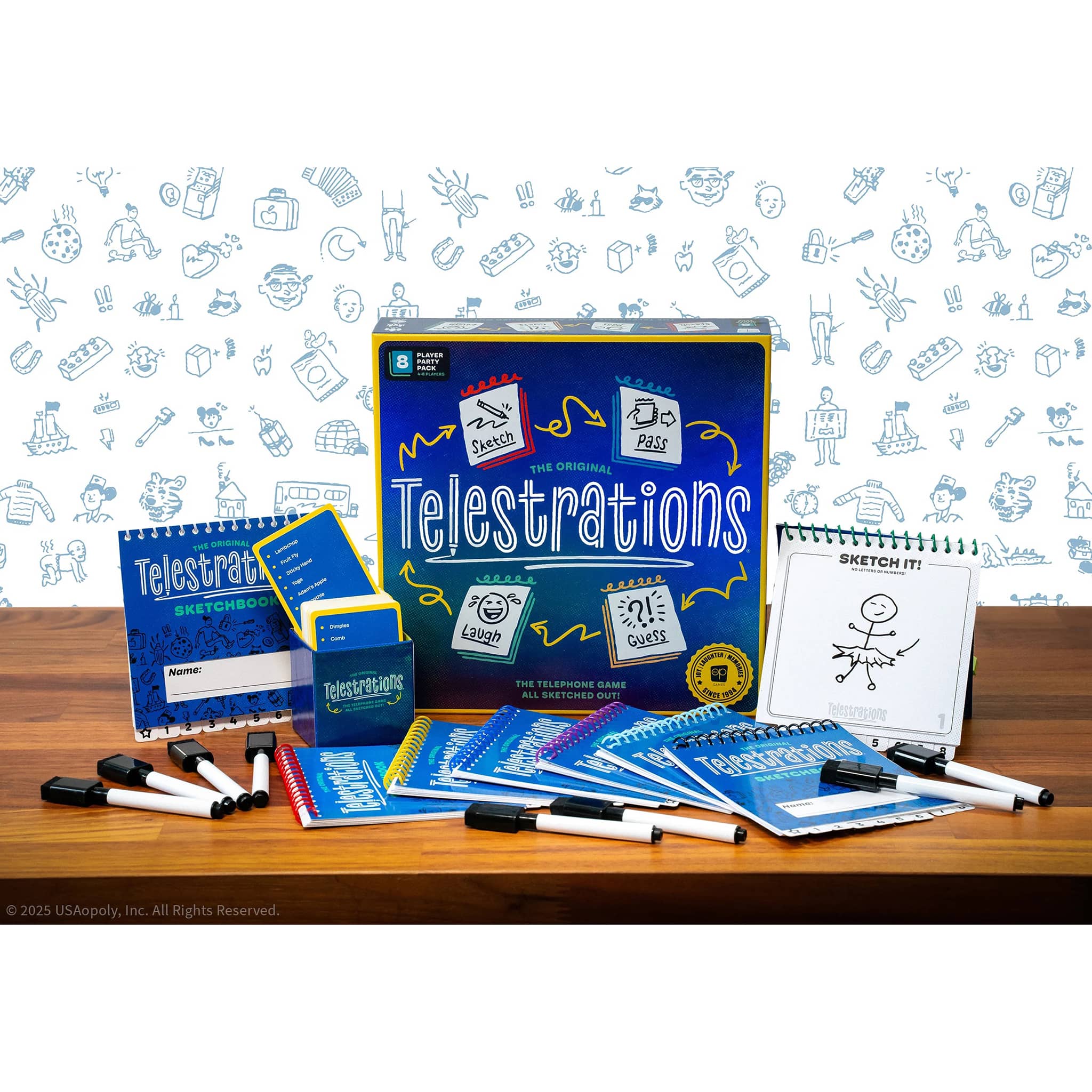 The award-winning party game Telestrations will get your family and friends laughing as they draw what they see, then guess what they saw for hours of hilarious miscommunication. All players simultaneously sketch, pass, and guess while revealing laugh-out-loud and unpredictable outcomes! Box includes 130 cards, 8 dry-erase markers, 8 reusable sketchbooks, and rules of the game.