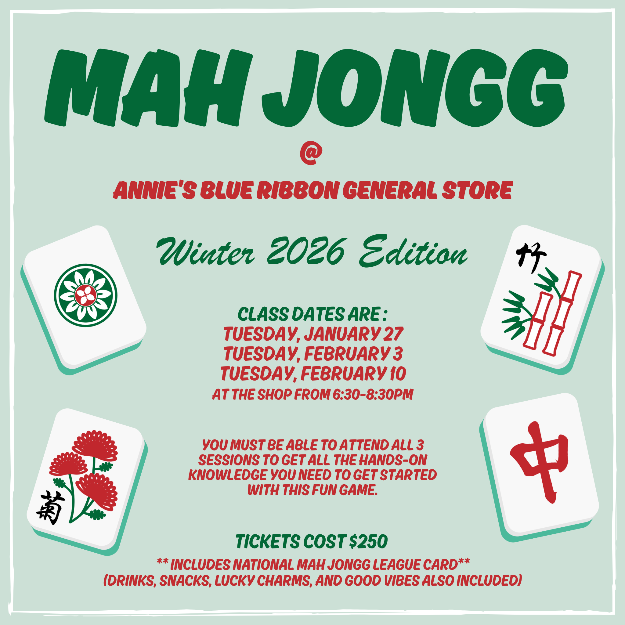 Join us for a comprehensive 3-class series designed specifically for beginners to learn how to play Mah Jongg! If you've ever heard about the Charleston, BAMS and cracks and wondered what language your friends were speaking or seen the gorgeous sets in the shop and are curious how to play, these classes are for you! You will learn the basics of gameplay, including what all the tiles mean, setup, and fundamental rules for this exciting social game of strategy and luck. This isn't just a lecture, you'll have hands-on experience shuffling tiles and playing as you learn. No prior knowledge needed!