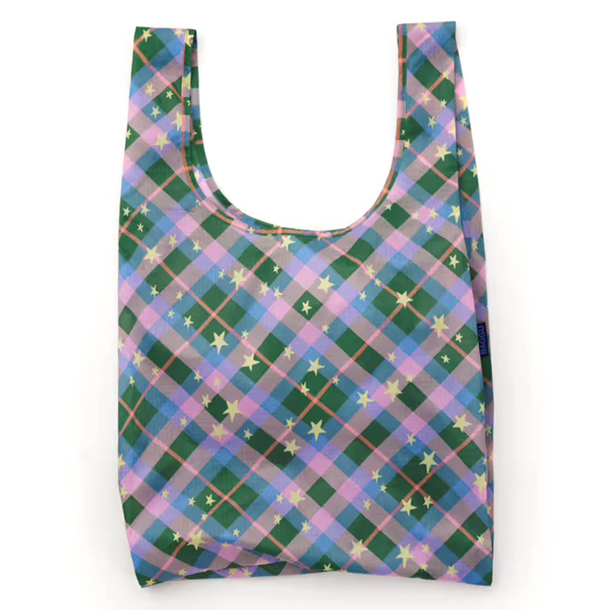 This best-selling eco-friendly reusable bag from BAGGU is not just for the grocery store, it can go everywhere and haul almost anything! The Green Star Plaid print features little stars in varying sizes on a pink, blue and green plaid backdrop. The built-in straps can be used as a shoulder bag or carried in your hand. Holds the equivalent of two to three single-use plastic grocery bags worth of stuff, up to 50 pounds!